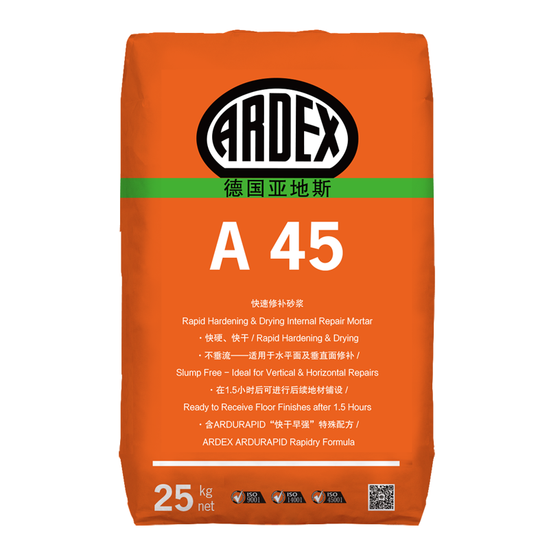 "ARDEX A45 is a rapid setting and drying, slump- free mortar for internal repairs."