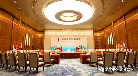 值得一提的是,五國大范圍會(huì)議室的主背景墻上6.75米高處,宋代名窯之一的德化瓷被做成了金磚五國國花的造型“貼”在了墻上。瓷磚膠正是采用了亞地斯(ARDEX)的輔材產(chǎn)品。